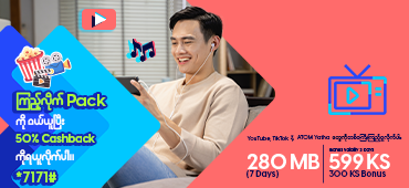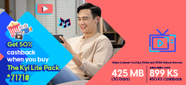 By purchasing the Kyi Lite package for just 899 Kyats and you can enjoy streaming services such as YouTube, TikTok, Viu, Mahar, Big9 (ATOM Yatha) while getting 450 Kyats cashback.
