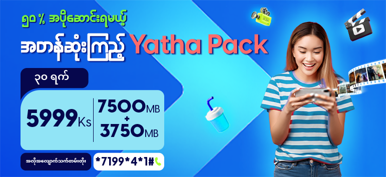 7500MB + 3750MB ပါပြီး ၅,၉၉၉ ကျပ်ပဲကျသင့်တဲ့ ရက် ၃၀ စာ 30 Days Yatha Pack ကို ဝယ်ယူလိုပါက Website (သို့) ATOM Store App (သို့) *7199*4*1# ကို ခေါ်ဆိုပြီး ဝယ်ယူနိုင်မှာဖြစ်ပြီး ကြိမ်ဖန်များစွာဝယ်ယူမှုအတွက် ပက်ကေ့ချ်သက်တမ်းတိုးသွားမှာပဲဖြစ်ပါတယ်။